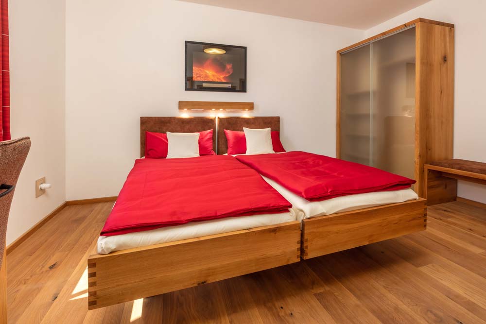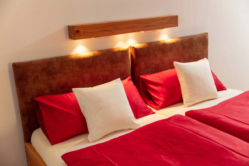 Jedes unserer Gästezimmer verfügt über einen großzügigen Schrank, einen Schreibplatz mit bequemem Polsterstuhl und Kofferablage. Die Betten sind mit 100% Naturlatexmatratzen und biologischen Zudecken ausgestattet.